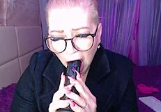 a cool busty vulgar mature whore in glasses ponytail licks juicy big pussy lips with dirty talk