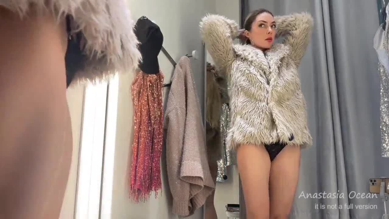 Hot blonde slut tries on clothes, showing off her big ass in public fitting room