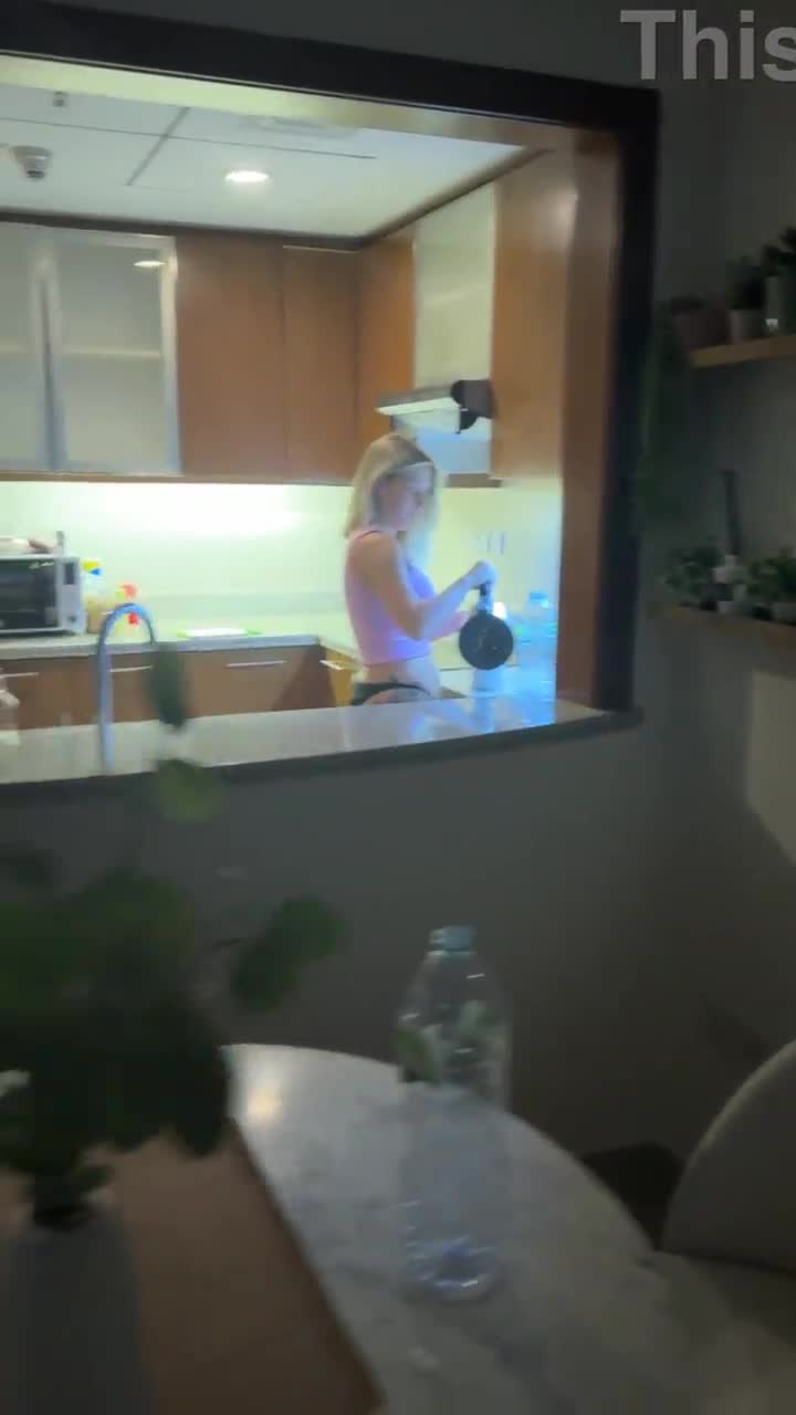 blonde housewife gives juicy blowjob in kitchen, frying pan in hand!